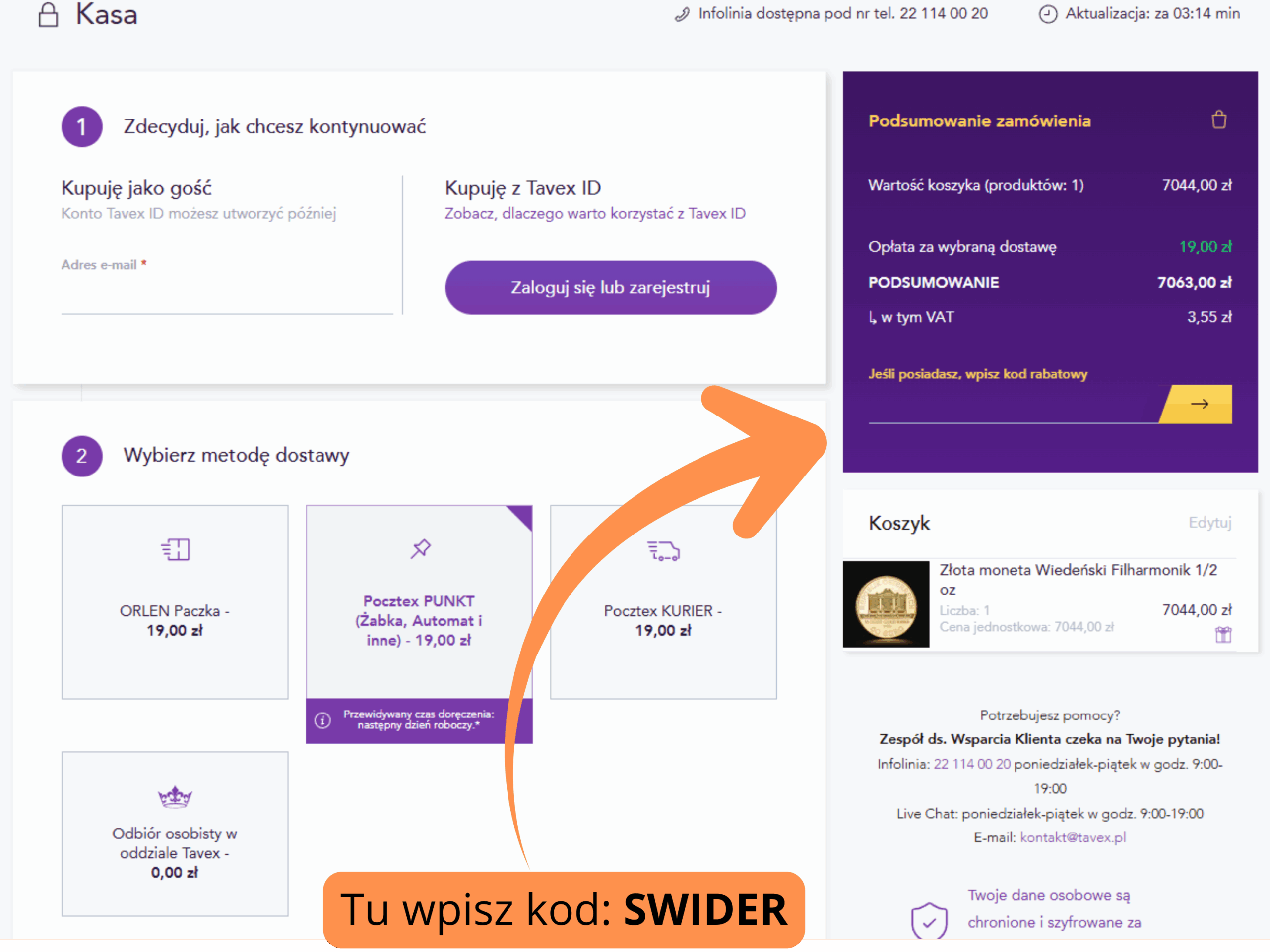 Po do dodaniu monety do koszyka i przejściu do kasy zdecyduj, czy chcesz dokonać zakupu jako gość, czy zalogować się / zarejestrować w Tavex ID, a następnie wybierz interesującą Cię metodę dostawy.