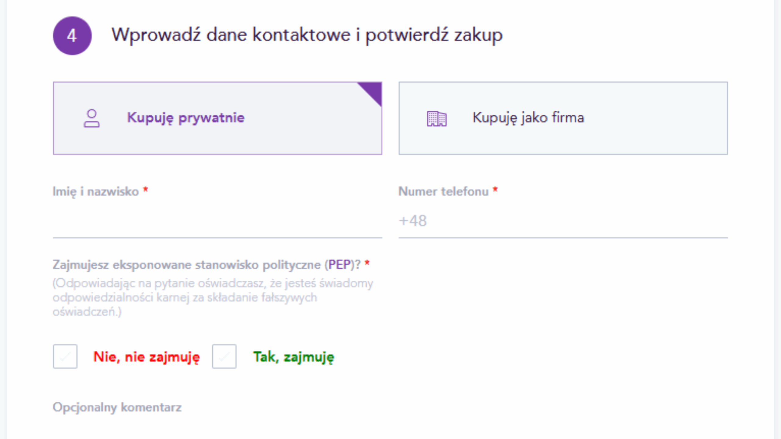 Zaznacz, czy kupujesz prywatnie, czy jako firma i wpisz swoje dane (Imię i nazwisko, numer telefonu) oraz odpowiedz na pytanie o zajmowanie stanowiska politycznego (PEP).
